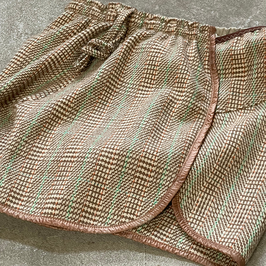 Run shorts made-to-measure from an ultra-soft 100% cashmere tweed. 100% merino wicking support liner. Single needle stitching, split side joint and hand dyed binding. Five pockets balanced for running with waist elastic graded to your measurements for ideal compression. Hygroscopic cashmere will